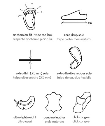 The sole is thin – 3.5 mm, completely flexible and flat (zero drop), allowing natural posture, correct muscle activation, and free ankle movement.