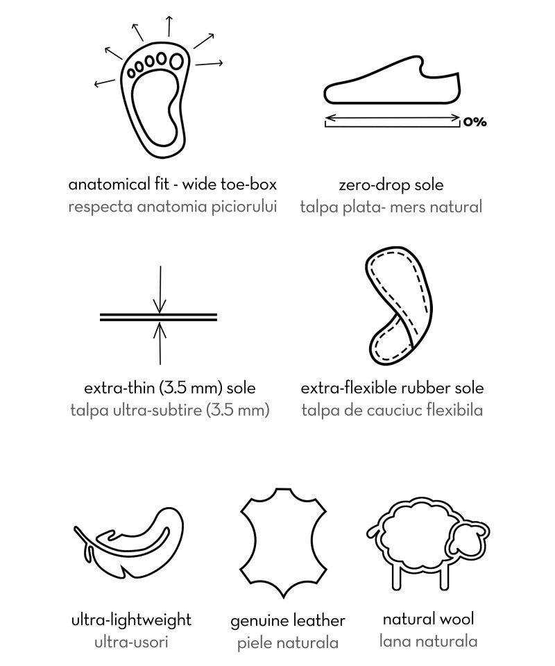 ✔️ Talpă ultra-subțire de 3,5 mm, complet flexibilă și dreaptă (zero drop), care susține postura naturală, activează corect mușchii și lasă glezna să se miște liber.